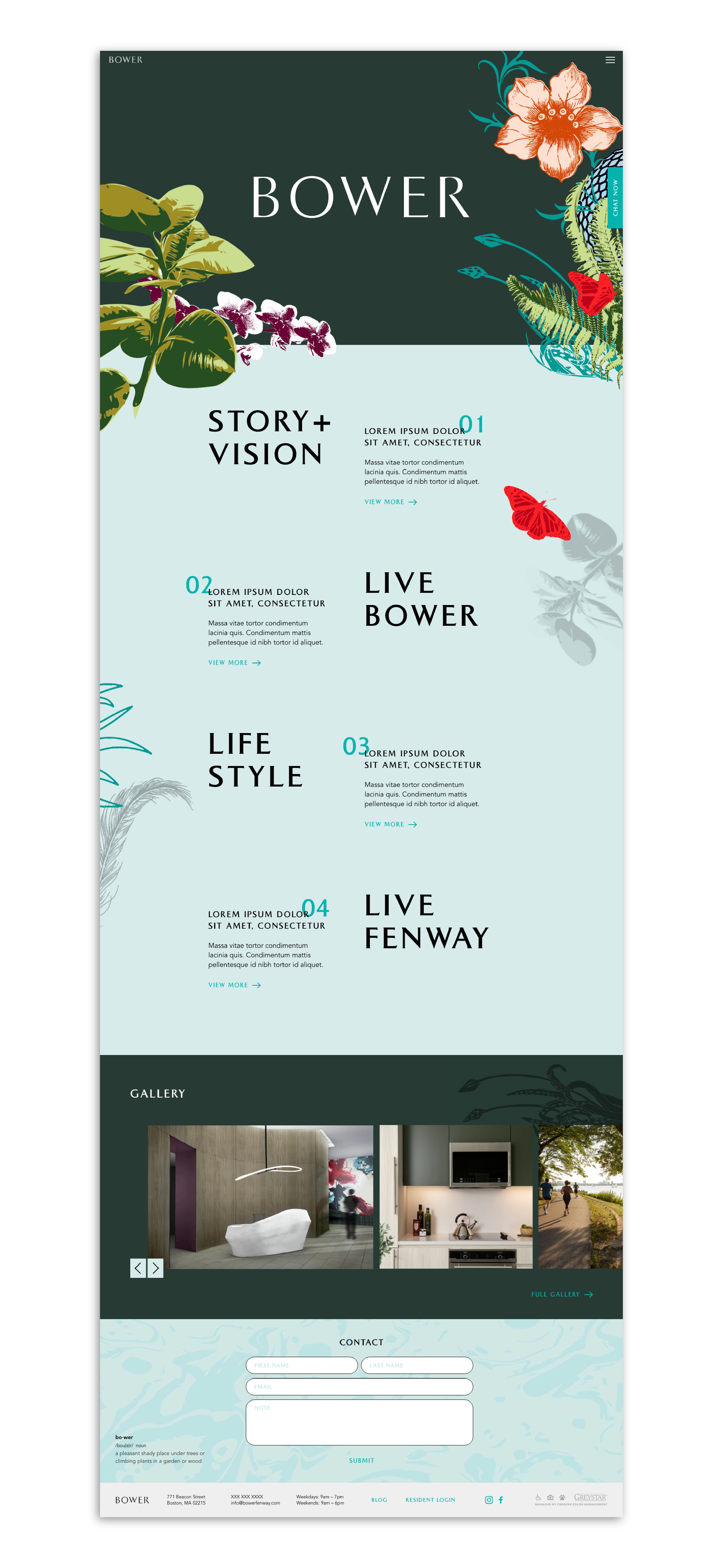 Using the brand’s lively illustrations, I created an impression of the lush flora and fauna “unfurling” throughout the site. These pair with Bower’s dramatic photography to bring the space to life.