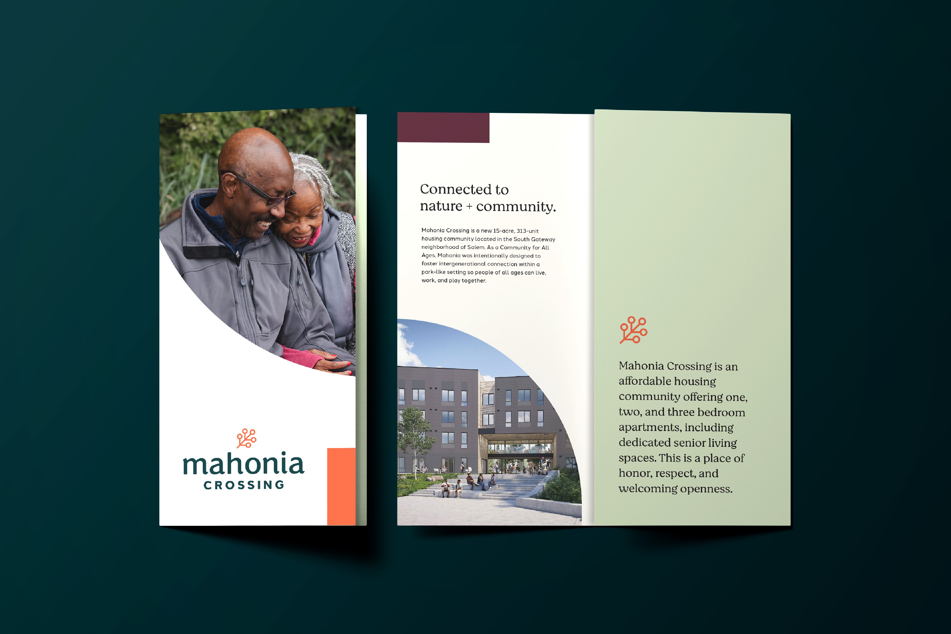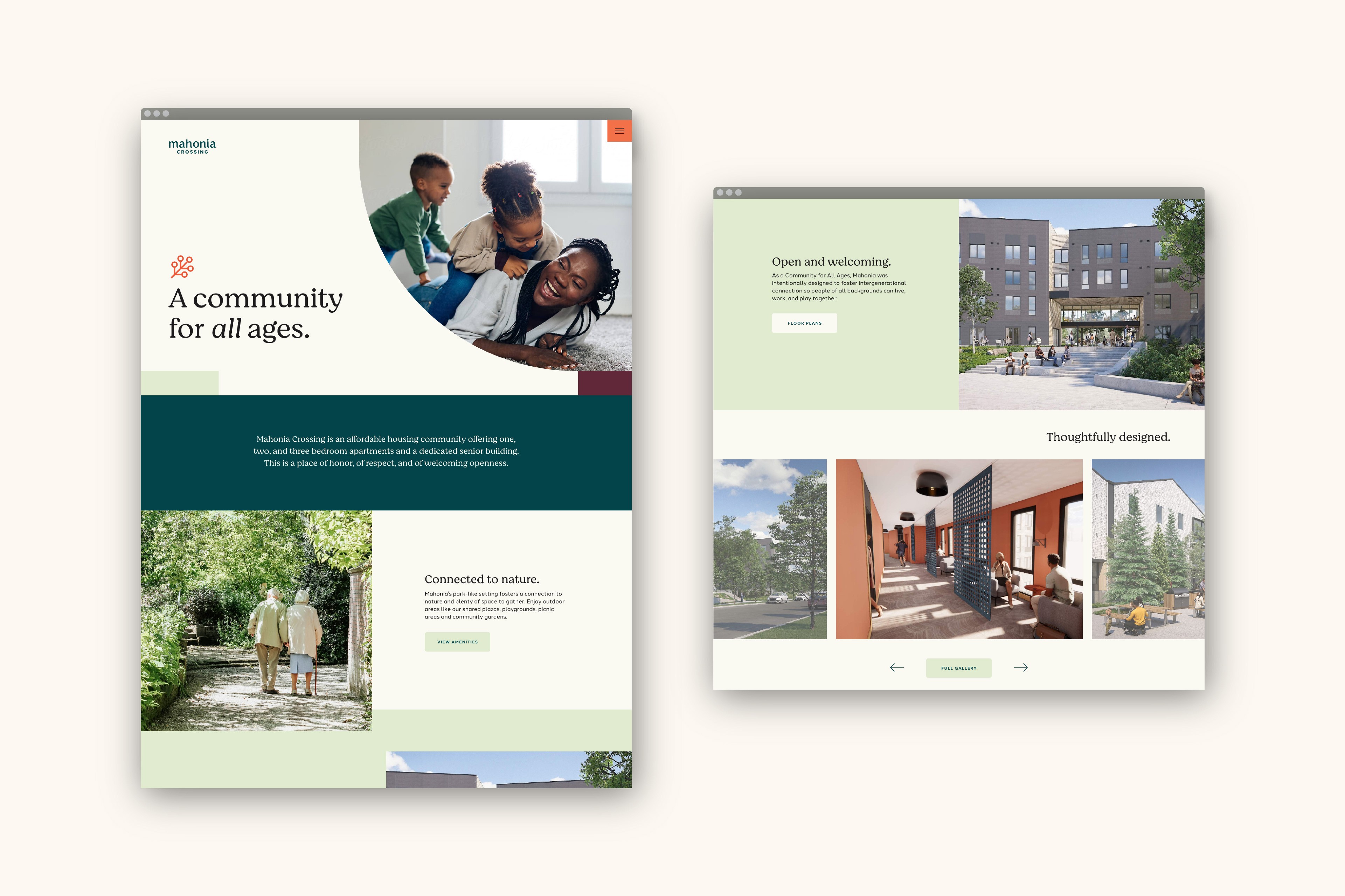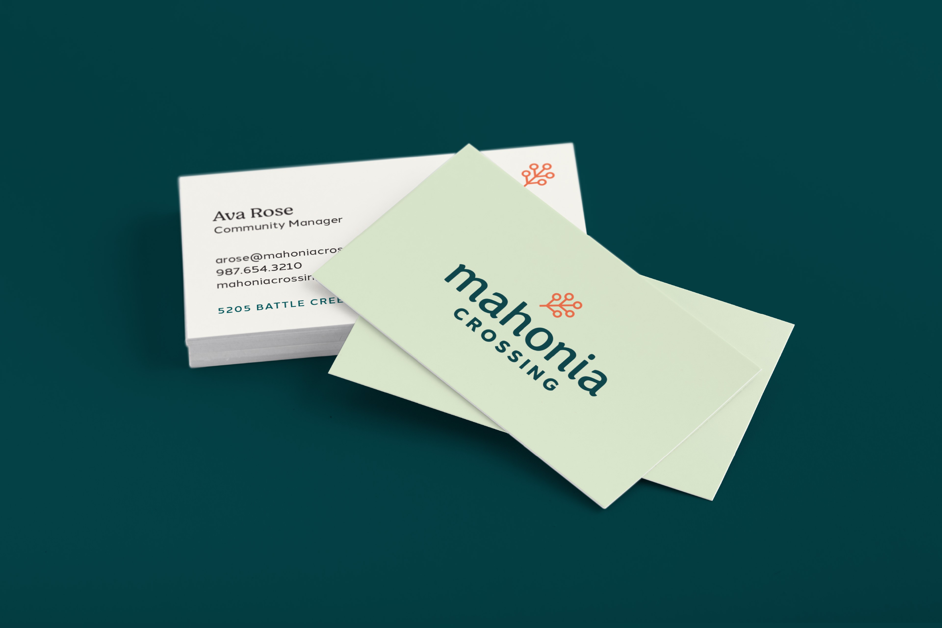 Curving typography and friendly colors represent Mahonia's welcoming atmosphere. The brand mark, which depicts the berry of a mahonia plant, represents the community's goal of connecting residents to nature and across generations.